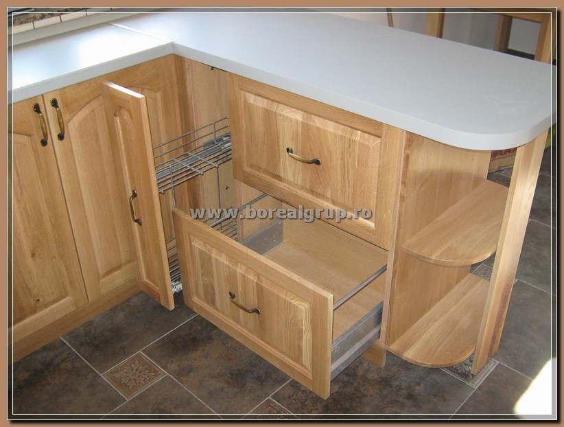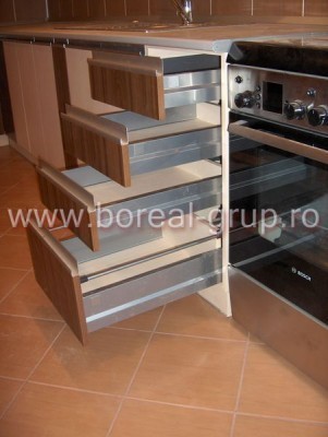 Bucatariile marca Boreal GRUP sunt foarte bine accesorizate. Ca si accesorii pentru bucatarii folosim Blum (Austria), sau Hefele (Germania). La mobilierul de bucatarie se pot folosi atat sisteme simple de feronerie (balamale, glisiere etc), cat si sisteme complexe cum ar fi Blumotion (sertare si usi care nu se trantesc) si multe altele. Totodata, in mobila de bucatarie realizata de Boreal GRUP se pot incadra atat electrocasnicele incastrabile, cat si cele clasice.